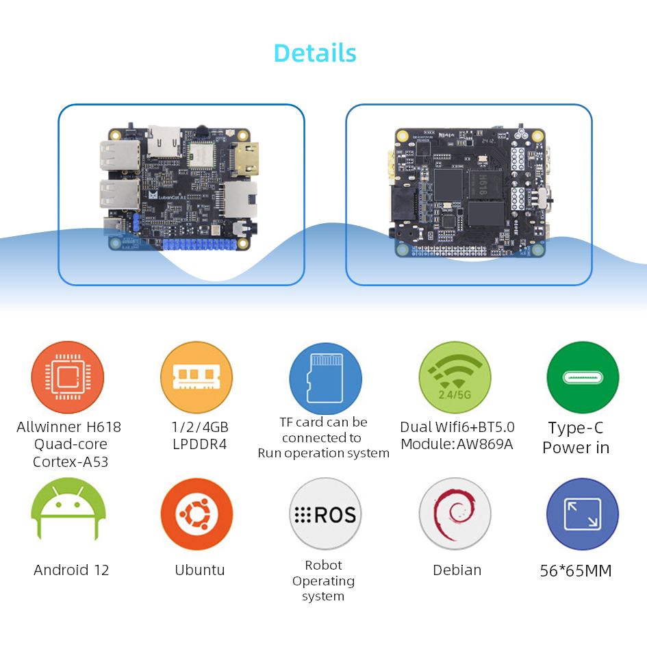Dual-Band Wif5.0 Wif5.0 Wif5.0 wif2.0 wif2.0 wif2.0 wifi6 + bt5.0 ဖြင့် HDMI2.0, GigiAd Ethernet, TF ကဒ်ကိုင်ဆောင်သူနှင့်အခြားအရံပစ္စည်းများနှင့်အတူ allwinner H618 ကိုအသုံးပြုသည်။ Gigio, SPI, UART, PWM functions များကိုထုတ်လုပ်ခြင်း,